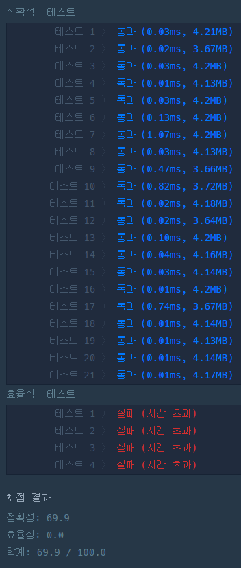 하지만 결과는 테스트 케이스는 통과했으나, 효율성에서 0점...